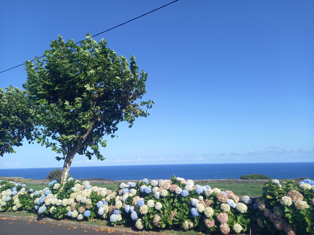 Continuing toward the coast, the trail begins a gentle descent. In the distance, the shimmering Atlantic Ocean begins to dominate the view. You’ll pass through stretches of wild scrub and low coastal vegetation before finally arriving in Biscoitos, a charming village famous for its wine and natural swimming pools carved out of black basalt.