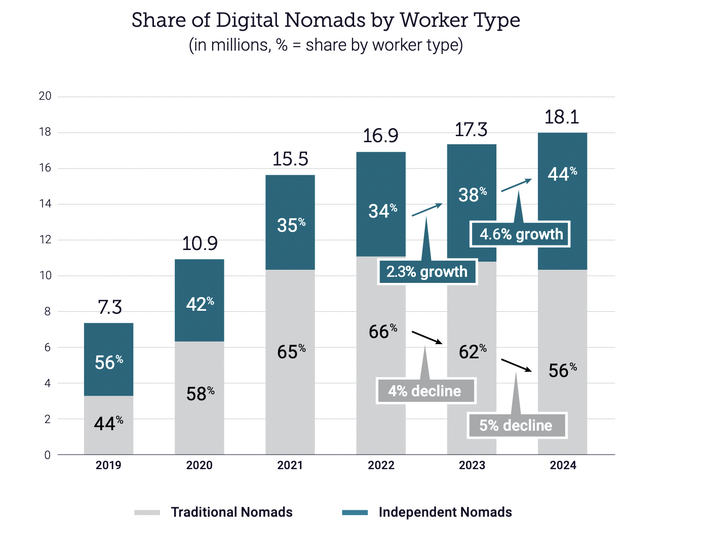 - By 2023, estimates suggest that globally there are over 35 million digital nomads — a number expected to keep growing exponentially.