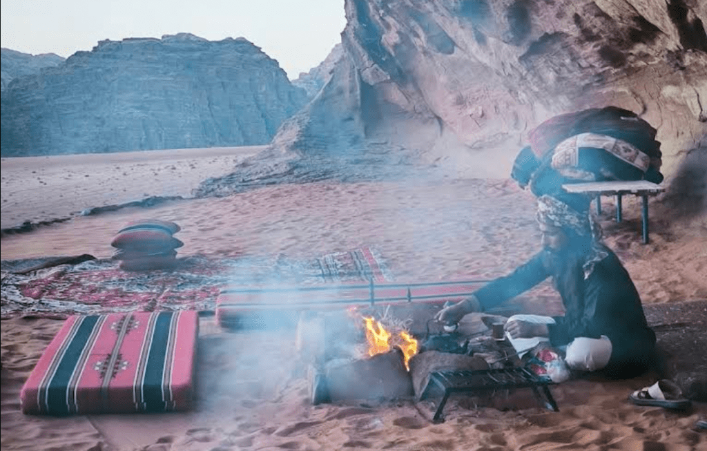 On trekking routes or guided expeditions, your Bedouin guide may set up a mobile camp deep in the desert, far from the fixed camp zones. There are no buildings, no lights, just a simple fire, sleeping mats, and a sky that stretches untouched across the horizon. Dinner is cooked on open coals. It’s the most raw and immersive way to experience Wadi Rum. If this is the type of experience you want to have, then contact Rum Planet Camp to customize your trip.