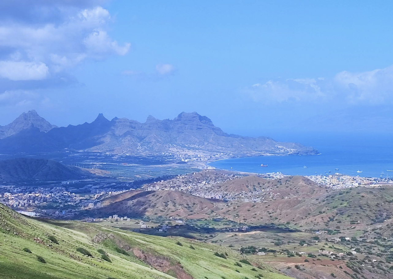 At the top, you’re rewarded with a sweeping 360-degree panorama. From here, the island unfolds beneath you: Mindelo’s harbor curves along the coastline, Laginha Beach appears as a soft golden arc against the deep blue ocean, and the surrounding hills stretch out in muted tones of brown and green. On especially clear days, you can even spot the dramatic peaks of Santo Antão rising across the water—a reminder of just how close, yet how different, the neighboring island is.