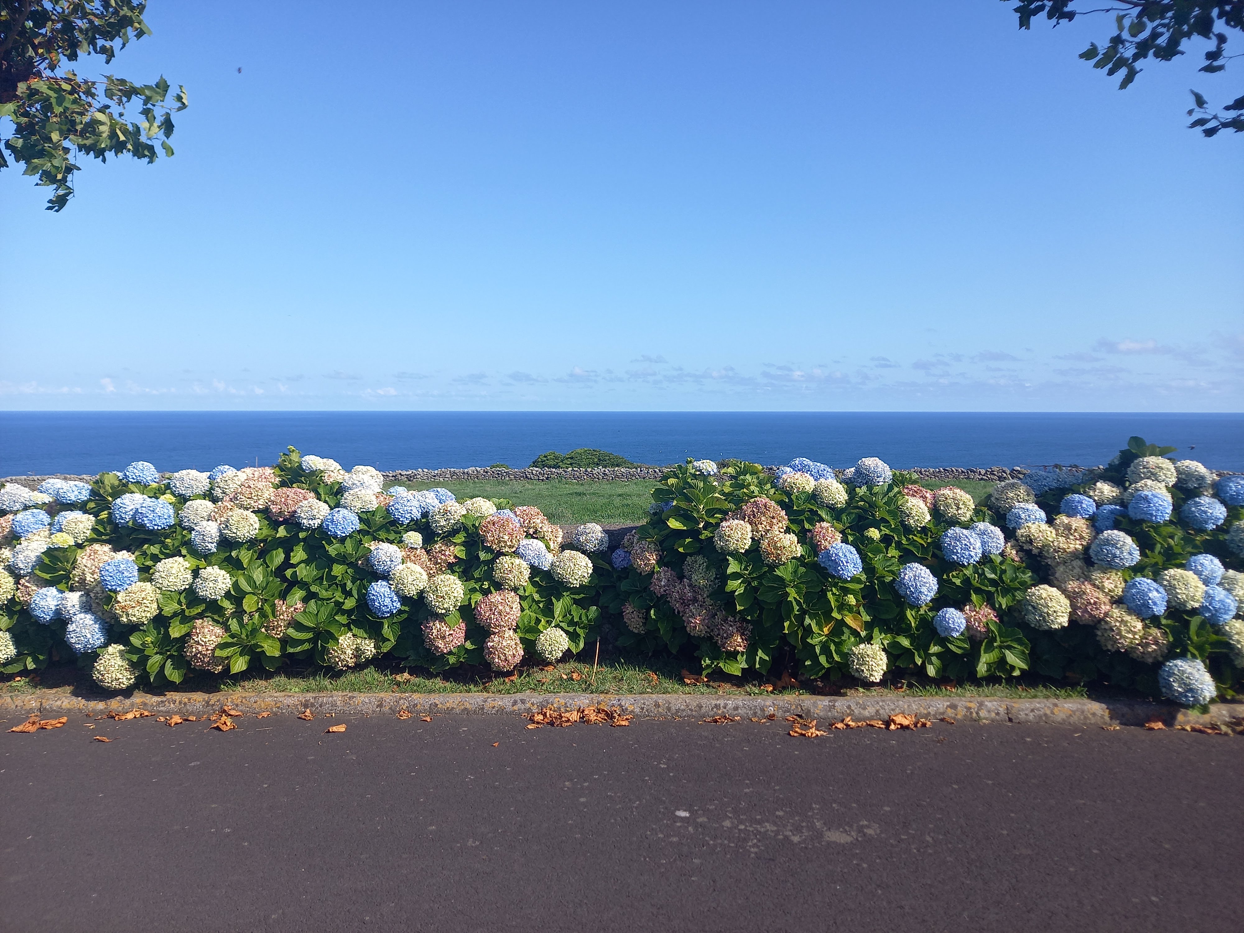 From here, the trail loops back and heads through a small woodland area dominated by Azorean heather. The route then descends into open pastureland, with cliffs on one side and willow trees on the other, and sweeping views back toward the Mina islets.